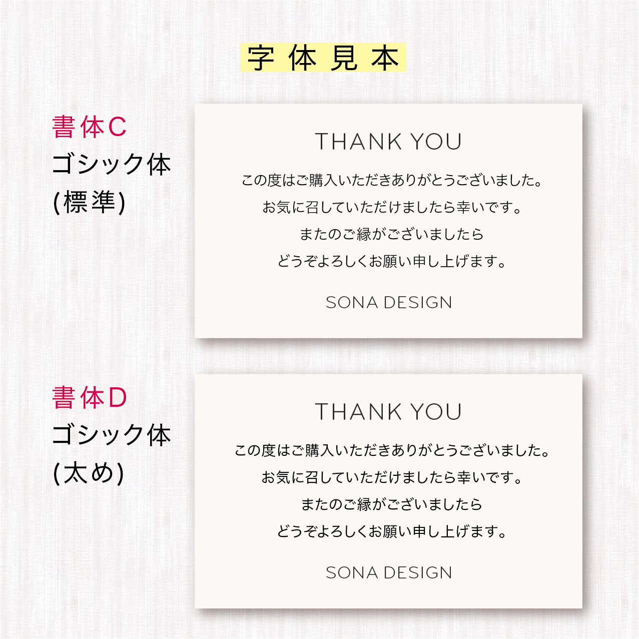 完全フルオーダーのメッセージカードです。 ✓ギフトに添えるカードとして ✓結婚式のアイテムとして ✓内祝いに添えるカードとして ✓フリマアプリの商品に添えるカードとして ✓ショップカードとして さまざまな場面でご利用ください。 ――――――――――――――――――――― 【ご注文の際のお知らせ】 ・カードに入れたい内容をお伝えください。 ・デザインイメージをお伝えください。 ・字体は画像見本からお選びください。 【字体について】 画像2〜4枚目の書体見本をご覧ください。 画像見本から書体をお選びください。 ――――――――――――――――――――― 【お伝え方法について】 カードに記載する内容をお聞かせください。 下記の方法からお伝え方法をお選びください。 ①注文時に備考欄に記入 ②メールで伝える (当社メールアドレス宛まで) ③注文完了後に当ショップから届くメールに返信して伝える ▶▶備考欄の場所について https://sonadesign.thebase.in/blog/2023/07/18/164544 【写真やQRコードの送付方法について】 写真やQRコードを名刺に載せる場合は、当社メールアドレス宛にご送付ください。 ▶▶当社メールアドレスはこちら [email protected] 【ロゴを掲載される場合】 ロゴデータは、AI・PSD・EPSなどの、なるべく高解像度のデータをお送りください。 ――――――――――――――――――――― 【制作の流れ】 ①ヒヤリング カードに記載する内容をお伺いします。 ✓メッセージ ✓店舗名など ✓QRコードなど ↓ ②デザインご提案 デザイン制作を行います。 注文日から2日前後でデザイン案をお客様のメールアドレスへお送りします。 ※土日のご注文分は月曜日以降にご提案いたします。 ↓ ③デザイン修正 お客様にデザイン案を確認して頂きます。 ※修正箇所をお伺いして修正いたします。 ※修正の回数制限はございません。 ↓ ④印刷 デザインが決定しましたら印刷工程に入ります。 ↓ ⑤納品 印刷工程を終えましたら、ご指定のお届け先へ発送いたします。 ――――――――――――――――――――― 【用紙サイズについて】 91mm×55mm 【用紙について】 マットコート紙 220kg (追加料金なし) アートポスト紙 220kg (追加料金なし) ケント紙 220kg (追加料金なし) マシュマロ 200kg (+500円) クラフト紙 (ベージュ) 135kg (+500円) クラフト紙 (オーク) 135kg (+500円) リネン紙 129kg (+600円) 表面 和紙 / 裏面 ケント紙 180kg (+1200円) ■マットコート紙 光沢を抑えた半光沢紙です。しっとりとした感触で、落ち着いた雰囲気の用紙です。光沢を抑えた用紙ですが、インキの発色はよく写真も鮮やかに印刷されます。また、光沢が抑えられているため反射されにくく文字が読みやすい利点があります。筆記性にも優れており、ボールペンなどの書き込みやスタンプ捺印も可能です。 ■アートポスト紙 表面にツルツルとした光沢コーティングが施された人気の用紙です。フルカラー印刷の相性は良く、色彩の発色が良く写真は色鮮やかに印刷されます。 ※カードに文字を書かれる場合、油性ボールペン、マジックの書き込みは可能です。ボールペン、鉛筆などは滲みますのでご注意ください。 ■ケント紙 表面が平らで滑らかな肌触りの用紙です。紙の色は白く、光沢をおさえたしっとりとした仕上がりになっています。筆記特性に優れており、 鉛筆、ボールペンなど手書きでも書きやすく、印鑑も押しやすいのでショップカードやスタンプカードによく使われます。 ■マシュマロ紙 表面がやわらかくさらさらとしたマシュマロのような触り心地の用紙です。発色がよくフルカラーや写真も色鮮やかに印刷されます。 ■クラフト紙 (ベージュ) パルプ配合のうすめベージュのクラフト紙です。 カードの厚みは135kgで、コピー用紙と官製はがきの中間くらいの厚みです。 あたたかみがあり優しい雰囲気の用紙です。 ■クラフト紙 (オーク) パルプ配合で、クラフト紙(ベージュ)よりも濃いクラフト紙です。 カードの厚みは135kgで、コピー用紙と官製はがきの中間くらいの厚みです。 あたたかみがあり優しい雰囲気があります。 ■リネン紙 全体に穏やかな絹目の織り模様がある上品な用紙です。 カードの厚みは129kg、コピー用紙と官製はがきの中間くらいの厚みです。 ■表面 和紙 / 裏面 ケント紙 表面は、羽のような模様が入った高級感ある和風風の用紙です。 羽の模様部分は光があたるときらきら光ります。 ※裏面はケント紙です。 ▶▶用紙の詳細ページはこちら https://sonadesign.thebase.in/blog/2023/05/22/143335 【出荷予定日の数え方】 4営業日の場合:デザイン決定が10月10日の場合は10月14日に出荷。 2営業日の場合:デザイン決定が10月10日の場合は10月12日に出荷。