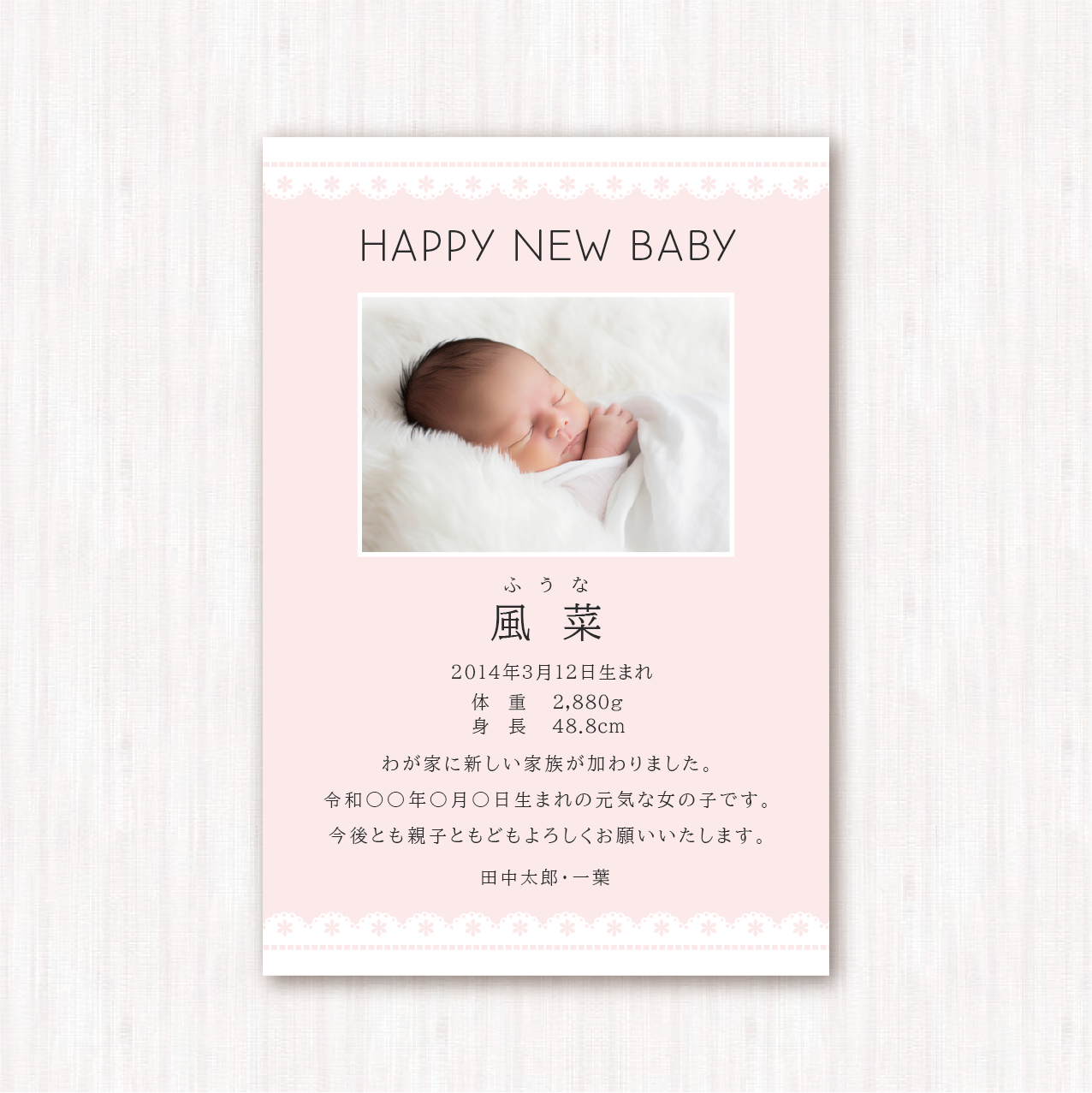出産内祝いカード はがきサイズ かわいい レース ピンク 100枚 | SONA DESIGN