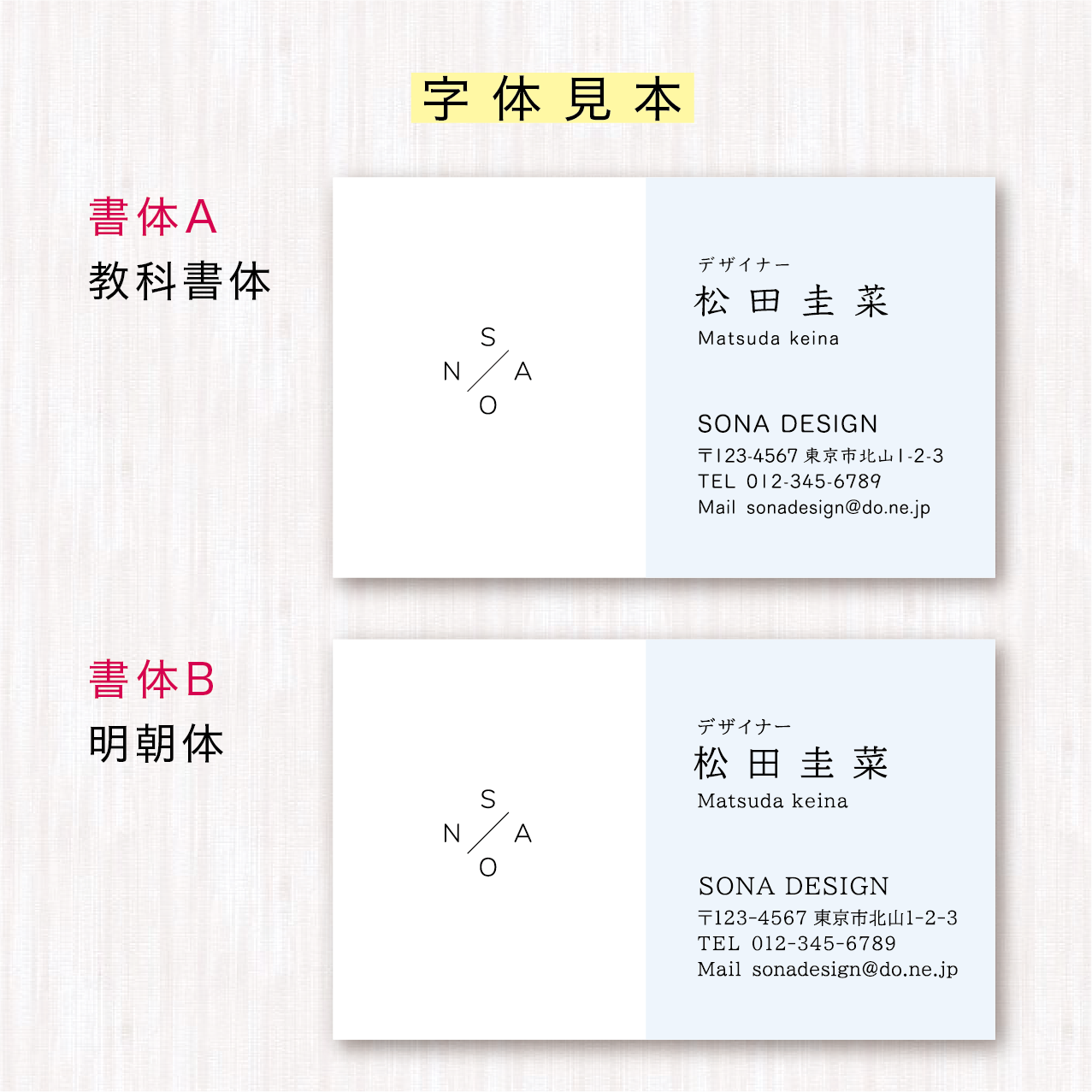✓名刺の背景色を変えたい ✓文字を太く大きくしたい ✓QRコードを載せたい ✓写真を載せたい ✓書体見本にないフォントにしたい など…様々なご要望に対応可能の両面名刺です。 ――――――――――――――――――――― 【変更可能でオリジナル名刺に】 ✓文字サイズの変更OK。 ✓背景色の変更OK。 ✓追加文章OK。 ✓文字色の変更OK。 ✓QRコードなどの追加もOK。 【字体について】 画像2〜4枚目の書体見本をご覧ください。 画像見本から書体をお選びください。 【裏面について】 画像5枚目〜12枚目をご参照ください。 ――――――――――――――――――――― 【カードに記載する情報について】 カードに記載する内容をお聞かせください。 下記の方法からお伝え方法をお選びください。 ①注文時に備考欄に記入 ②メールで伝える (当社メールアドレス宛まで) ③注文完了後に当ショップから届くメールに返信して伝える ▶▶備考欄の場所について https://sonadesign.thebase.in/blog/2023/07/18/164544 【写真やQRコードの送付方法について】 写真やQRコードを名刺に載せる場合は、当社メールアドレス宛にご送付ください。 ▶▶当社メールアドレスはこちら [email protected] 【ロゴを掲載される場合】 ロゴデータは、AI・PSD・EPSなどの、なるべく高解像度のデータをお送りください。 ――――――――――――――――――――― 【制作の流れ】 ①ヒヤリング カードに記載する内容をお伺いします。 ↓ ②デザインご提案 デザイン制作を行います。 翌日までにデザイン案をお客様のメールアドレスへお送りします。 ※土日のご注文分は月曜日にご提案いたします。 ↓ ③デザイン修正 お客様にデザイン案を確認して頂きます。 ※修正箇所をお伺いして修正いたします。 ※修正の回数制限はございません。 ↓ ④印刷 デザインが決定しましたら印刷工程に入ります。 ↓ ⑤納品 印刷工程を終えましたら、ご指定のお届け先へ発送いたします。 ――――――――――――――――――――― 【用紙サイズについて】 91mm×55mm 【用紙について】 マットコート紙 220kg (追加料金なし) アートポスト紙 220kg (追加料金なし) ケント紙 220kg (追加料金なし) マシュマロ 200kg (+500円) クラフト紙 (ベージュ) 135kg (+500円) クラフト紙 (オーク) 135kg (+500円) リネン紙 129kg (+600円) 表面 和紙 / 裏面 ケント紙 180kg (+1200円) ■マットコート紙 光沢を抑えた半光沢紙です。しっとりとした感触で、落ち着いた雰囲気の用紙です。光沢を抑えた用紙ですが、インキの発色はよく写真も鮮やかに印刷されます。また、光沢が抑えられているため反射されにくく文字が読みやすい利点があります。筆記性にも優れており、ボールペンなどの書き込みやスタンプ捺印も可能です。 ■アートポスト紙 表面にツルツルとした光沢コーティングが施された人気の用紙です。フルカラー印刷の相性は良く、色彩の発色が良く写真は色鮮やかに印刷されます。 ※カードに文字を書かれる場合、油性ボールペン、マジックの書き込みは可能です。ボールペン、鉛筆などは滲みますのでご注意ください。 ■ケント紙 表面が平らで滑らかな肌触りの用紙です。紙の色は白く、光沢をおさえたしっとりとした仕上がりになっています。筆記特性に優れており、 鉛筆、ボールペンなど手書きでも書きやすく、印鑑も押しやすいのでショップカードやスタンプカードによく使われます。 ■マシュマロ紙 表面がやわらかくさらさらとしたマシュマロのような触り心地の用紙です。発色がよくフルカラーや写真も色鮮やかに印刷されます。 ■クラフト紙 (ベージュ) パルプ配合のうすめベージュのクラフト紙です。 カードの厚みは135kgで、コピー用紙と官製はがきの中間くらいの厚みです。 あたたかみがあり優しい雰囲気の用紙です。 ■クラフト紙 (オーク) パルプ配合で、クラフト紙(ベージュ)よりも濃いクラフト紙です。 カードの厚みは135kgで、コピー用紙と官製はがきの中間くらいの厚みです。 あたたかみがあり優しい雰囲気があります。 ■リネン紙 全体に穏やかな絹目の織り模様がある上品な用紙です。 カードの厚みは129kg、コピー用紙と官製はがきの中間くらいの厚みです。 ■表面 和紙 / 裏面 ケント紙 表面は、羽のような模様が入った高級感ある和風風の用紙です。 羽の模様部分は光があたるときらきら光ります。 ※裏面はケント紙です。 ▶▶用紙の詳細ページはこちら https://sonadesign.thebase.in/blog/2023/05/22/143335 【出荷予定日の数え方】 4営業日の場合:デザイン決定が10月11日の場合は10月15日に出荷。 2営業日の場合:デザイン決定が10月11日の場合は10月13日に出荷。